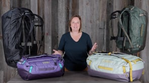 Open blue Osprey travel bag on a white background Blue backpack with black straps on a white background Man opening a green duffel bag in a rocky outdoor setting with text about the bag's features. Person wearing a large black backpack with text describing the 'Gear Hauler' product. Person packing a backpack with text about lightweight, durable protection and water-resistant fabric. Person wearing a purple backpack on a white background Person wearing a teal shirt and brown pants with a purple backpack on a white background Man holding a purple backpack on a white background Man holding a purple duffel bag against a white background Green and gray duffel bag with yellow accents on a white background Green backpack with yellow straps on a white background